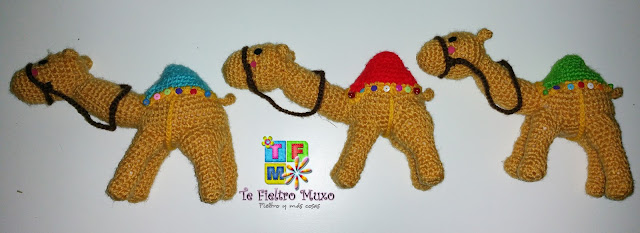 A los camellos les puse lentejuelas en vez de cositas colgando...ya sabeis que me encanta cambiarles cositas a los patrones originales.